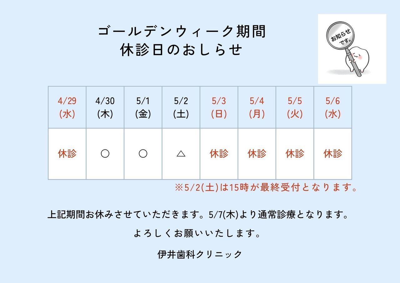 当院は土曜日も16時まで診療を行っていますので、お休みの日にゆっくりとお口の治療やケアを行いたいという方もご来院いただけます。