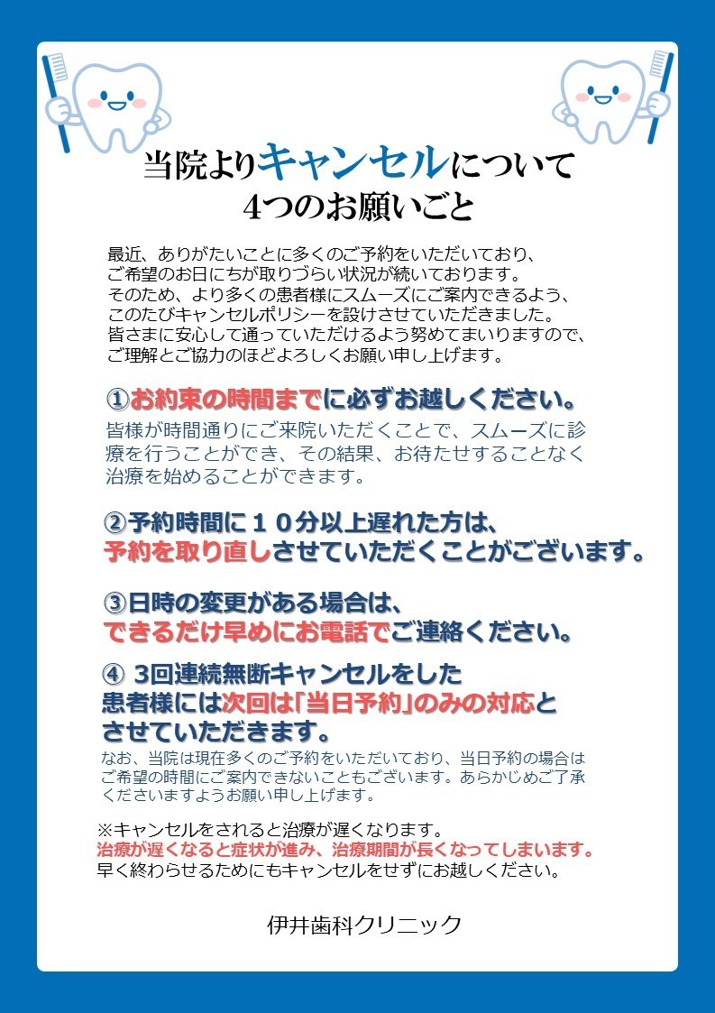 今回のキャンセルにつきましては可能な限りお早めのアポイントをご用意できるよう努めます。